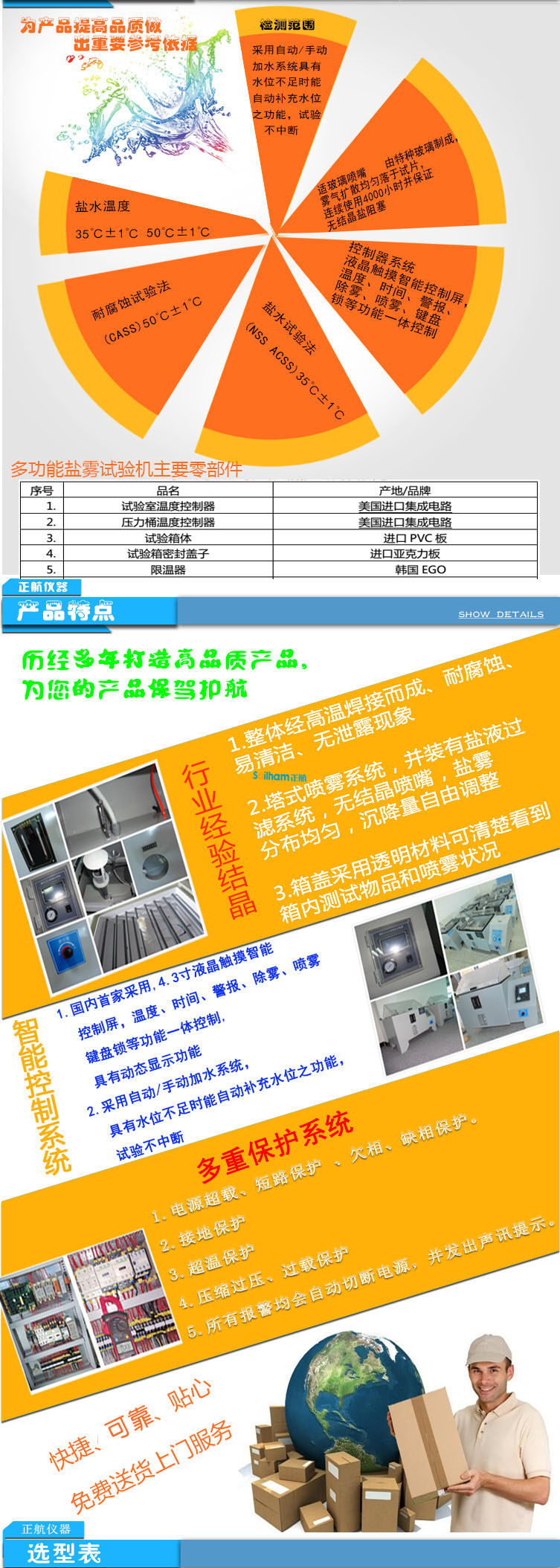 盐雾试验机加热系统: 箱体内试验温度为水套式加热加湿,加热器件采用国外先进的钛合金护管,内置镍铬合金远红外发热芯体。升温快,温度分布均匀;且比起玻璃钢箱体夹套式加热功耗节省约二分之一。六.执行标准: 本产品满足GB2423.17《电工电子产品基本规程试验Ka》,盐雾试验方法及GB10587、GJB150、DIN50021持续盐雾等及世界标准;我公司试验箱已通过国家环境试验设备检测中心检测合格。